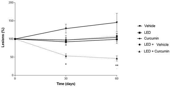 p < 0.05). After 60 days of treatment, treatment with LED + Curcumin (46.35 ± 18.63%,