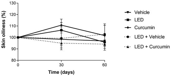 During the treatment period, the L + C group proved to be effective in reducing inflammatory lesions; however, for the reduction in oiliness, a long time applying LED therapy associated with curcumin may be necessary because in the time established in this study, there was a decrease in inflammatory lesions; however, there was no difference between groups in the percentage of oiliness.