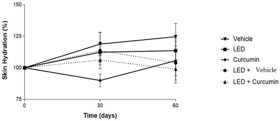 Regarding the values obtained for skin hydration, the L + C group went from 100% on day 0 to 106.24 ± 10.42% on day 30 and 98.96 ± 14.17% on day 60. Group V showed 118.81 ± 24.76% on day 30 and 124.64 ± 27.95% on day 60. Group L presented 112.37 ± 21.08% on day 30 and 113.56 ± 19.81% on day 60. Group C presented 89.93 ± 13.27% on day 30 and 105.64 ± 46.67% on day 60. Group L + V presented 113.67 ± 37.95% on day 30 and 103.88 ± 35.73% on day 60. The results showed no difference between the groups L + C, V, L, C, and L + V (