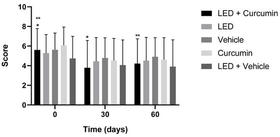 When evaluating the CADI questionnaire answers applied to research participants, no difference was found in the volunteers’ scores between the treated groups. Nevertheless, in an intragroup analysis, it was noted that the LED + Curcumin group presented a decrease in volunteers’ mean scores from 6.71 ± 3.09 on day 0 to 2.28 ± 2.05 on day 30 (