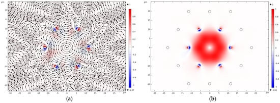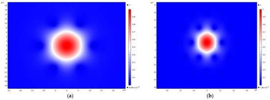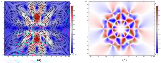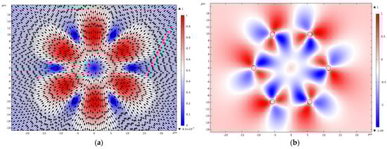 The vortex centers for this component are now located outside the cladding rods, and the cladding rods themselves transmit the maximum energy flow of the core mode in the radial direction. The azimuthal component of the Poynting vector of the fundamental core mode has the same symmetrical structure as that of holey fiber (Figure 3b and Figure 6b). The averaged values of the radial and azimuthal components for linear polarization are equal to and , respectively.