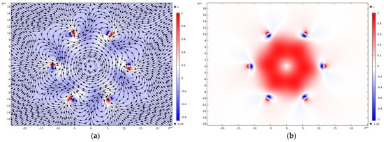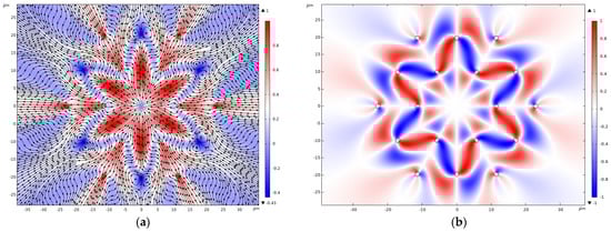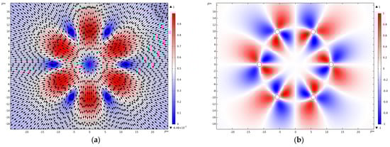 The azimuthal component of the Poynting vector of the fundamental core mode also exhibits vortex behavior (Figure 5b). The center of the vortices of the radial and azimuthal components of the Poynting vector lies inside the cladding rods. The averaged values of the radial and azimuthal components of the Poynting vector for elliptical polarization are equal to and , respectively.
