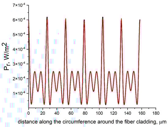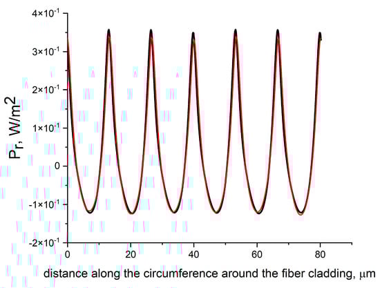 The resulting distribution of exactly corresponds to the vortex structure of the radial energy flows and stream lines of the transverse component of the Poynting vector shown in Figure 8 and Figure 9. The transmission peaks of fundamental core mode energy also correspond to every second rods in the second layer of the cladding rods. Negative values of the radial component of the Poynting vector are not observed in Figure 10 because the circle is located a little further from the maximum values of the reverse mode energy flows along the radial coordinate, but the distribution completely repeats the shape of the core mode energy movement in each of the vortices near the cladding rods of the second layer. Thus, the fundamental core mode energy flows out in the same way from the fiber cladding for both mode polarizations.
