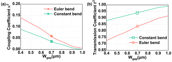 Euler bends were drawn in MATLAB with a waveguide width of 0.8 µm, a radius Rmin of 30 µm, and a radius Rmax of 1500 µm based on the microwave waveguide structure with modified Euler curves [33,34]. This set of parameters was selected because it shows a relatively low loss in the quasi-TE mode transmission within the C-band. To verify the impact of the Euler bends in the coupling region, FDTD simulations were implemented. Additionally, we analyzed a constant-bend waveguide with a radius of 80 µm and a width of 0.8 µm, as the length of the constant bend structure with this radius is equal to the Euler bend structure we used. After simulation, we could see that the coupling coefficient increased while the transmission coefficient decreased with the coupling gap decreasing when w1 = w2 = 0.8 μm, as shown in Figure 3a,b, respectively. Based on the evanescent-field coupling mechanism, as the coupling spacing between the waveguide and the microring increases, the overlap of the evanescent fields of the two decreases, which would consequently lead to a reduction in the coupling coefficient. However, if wgap continues to decrease, the coupling gap would become so small and then hard to be manufactured even if the desired coupling coefficient of 0.15 could be reached. Thus, another method to increase the coupling coefficient κ2 is to decrease the width of the incident waveguide w1.
