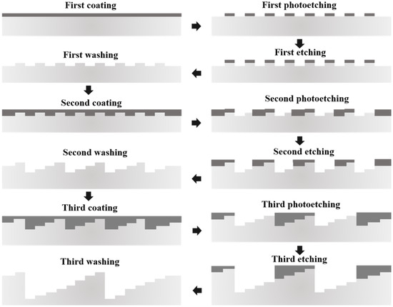 Compared with the traditional Fresnel lens, staircase diffractive surfaces lenses can achieve a reduction in light loss without increasing surface roughness, enabling the realization of optical designs that approach the scalar diffraction limit. Other than that, staircase diffractive surfaces lenses can increase the light flux efficiency of optical heads, which is particularly useful in applications requiring high light efficiency. So they can perform better in chromatic aberration control compared to Fresnel lenses, which is crucial for achieving chromatic correction and improving image quality. These advantages make staircase diffractive lenses promising for high-precision optical systems and imaging technologies [20,21,22]. The photolithography of the eight-level lightweight diffractive lens (as shown in Figure 1) is carried out using an LDW system (DWL66+, Heidelberg, Germany) with a positioning error of 100 nm (3σ). The pattern transfer process is performed using a Reactive Ion Etching machine (RIE600, developed by the Institute of Optics and Electronics, Chengdu, China). A schematic diagram of the diffractive pattern fabrication process is shown in Figure 2. The lightweight diffractive lens is made by designed optical level polyimide film (the thickness of the film is 25 µm) with high dimensional stability, high mechanical strength and high optical homogeneity [23,24]. The photolithography of the flexible polyimide membrane is conducted by a vacuum-assisted self-contact method [25].