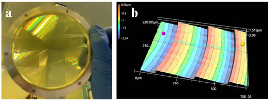 The eight-level diffractive lens was fabricated by photolithography and was made in optical-quality lightweight polyimide substrate with Φ50 mm diffractive pattern (Figure 6a). The etching depth and linewidth of each level were measured by confocal microscopy. The partial structure profilometer test results are shown in Figure 6b. The depth of each level is uniform (268 nm) across the whole diffractive pattern. The linewidth increases from the outer edge to inner edge. The smallest linewidth is 1.5 µm. The diffraction efficiency of the fabricated diffractive receiving objective was tested, and a diffraction efficiency testing setup was constructed. The measured average diffraction efficiency result was 78.2%. The reason for the lower diffraction efficiency compared to the theoretical values is mainly due to alignment errors and overlay errors during the fabrication process.