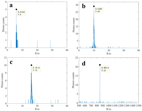 The experiments were conducted at night under good weather conditions. In the short-distance ranging experiments, a white paper (210 mm × 297 mm) was used as a target. The obtained photon-counting histograms for the echo of the A4 paper target are shown in Figure 8a–c. In the figures, the horizontal axis represents the measured distance, and the vertical axis represents the number of echo photons counted. From the short-range test results, it can be observed that the distances between the A4 white paper and the experimental setup are 6.0 m, 9.9 m, and 16.1 m, which are consistent with the actual distances of 6.0 m, 10.0 m, and 16.0 m, respectively. This demonstrates that the designed diffractive optical system applied to the LiDAR receiving end is effective and capable of successfully performing short-range measurements.