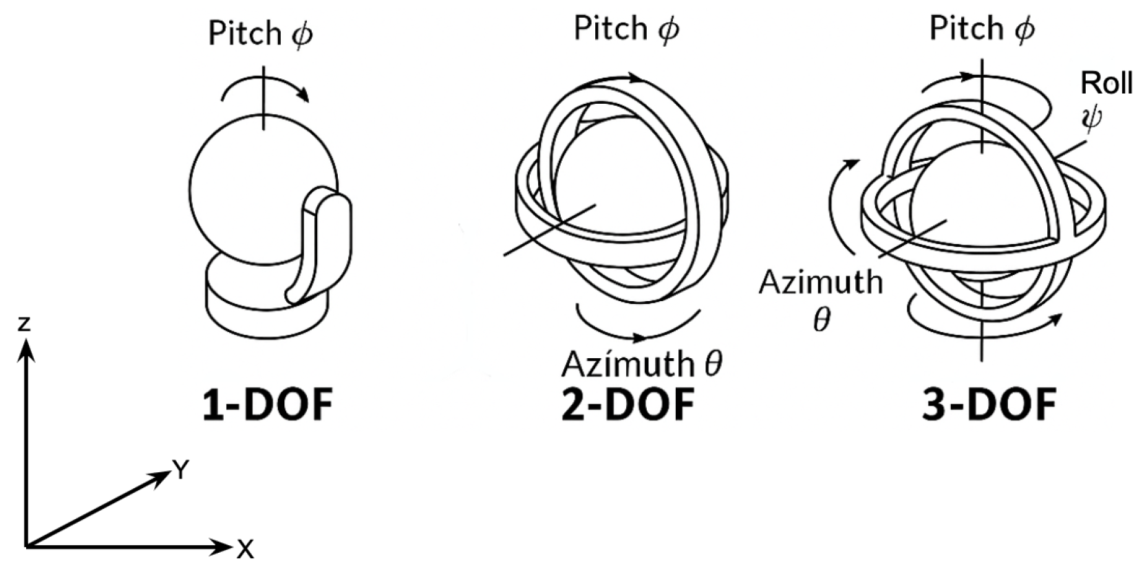 | Type | DoF | Motion Axes | Application | Power Consumption | Pointing Accuracy | Pros | Cons |
