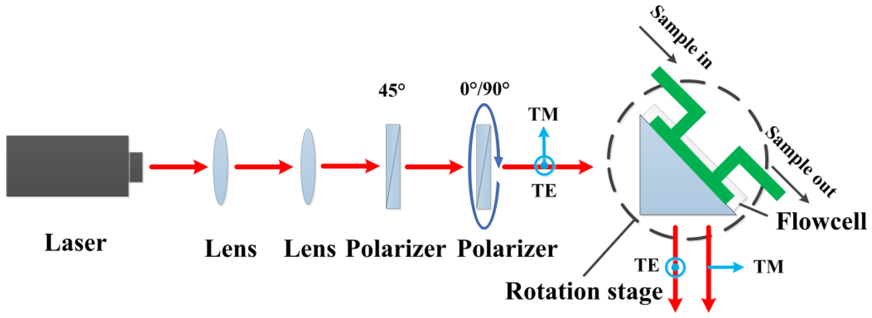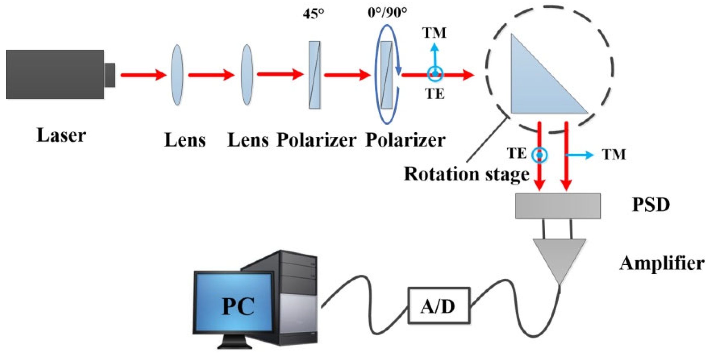 Next, a second polarizer is rotated to modify the incident light’s polarization direction: when the polarizer’s transmission axis is aligned horizontally (0°), transverse magnetic (TM) polarized light is obtained; when aligned vertically (90°), transverse electric (TE) polarized light is generated. The polarized light is then incident on an isosceles right-angle prism (Model PS911, Thorlabs, Newton, NJ, USA) and reflected at the prism’s inclined surface.