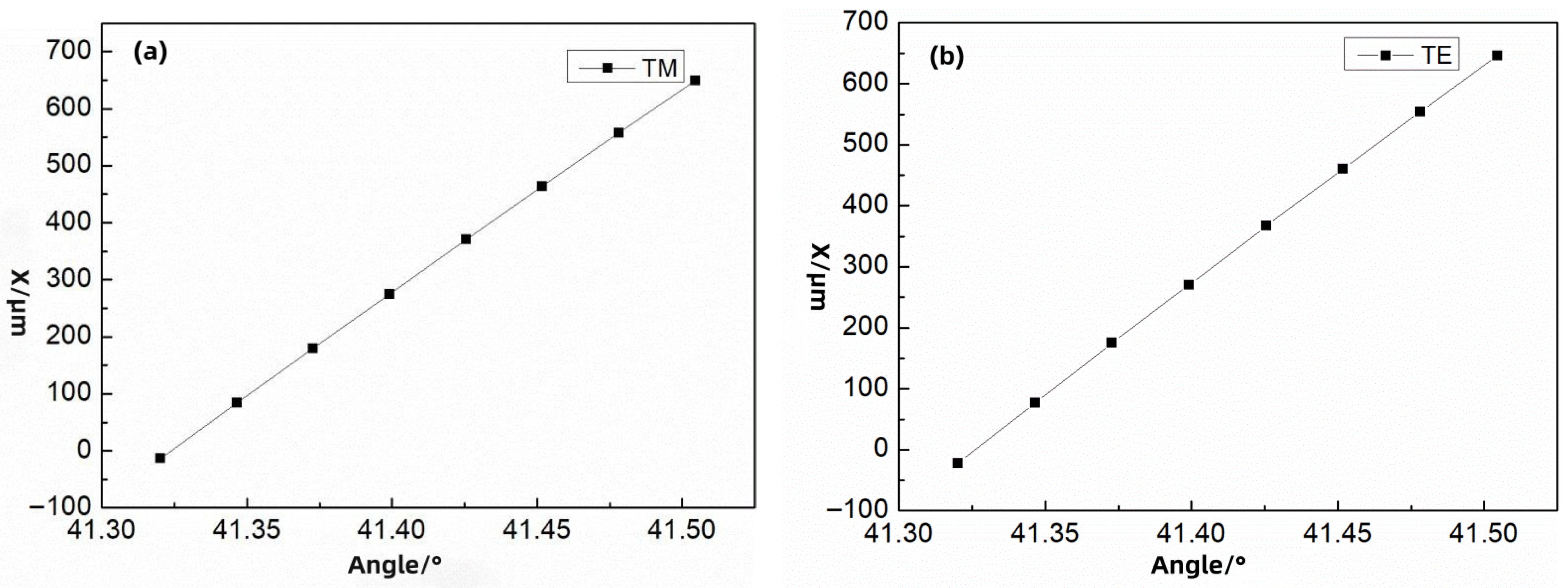 Figure 6. As observed from this figure, the light spot shifts along the positive X-axis direction of the detector as the incident angle increases. In the experimental measurements, the distance between the TM-polarized light and TE-polarized light (under non-total reflection conditions) was determined to be 1.3 μm.