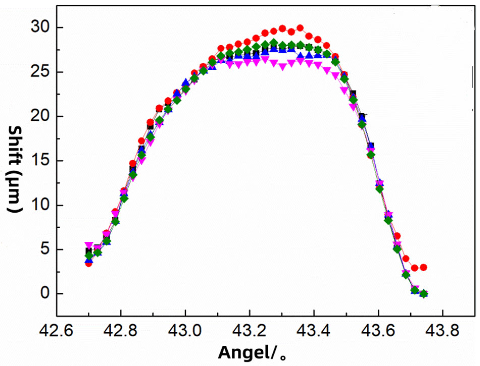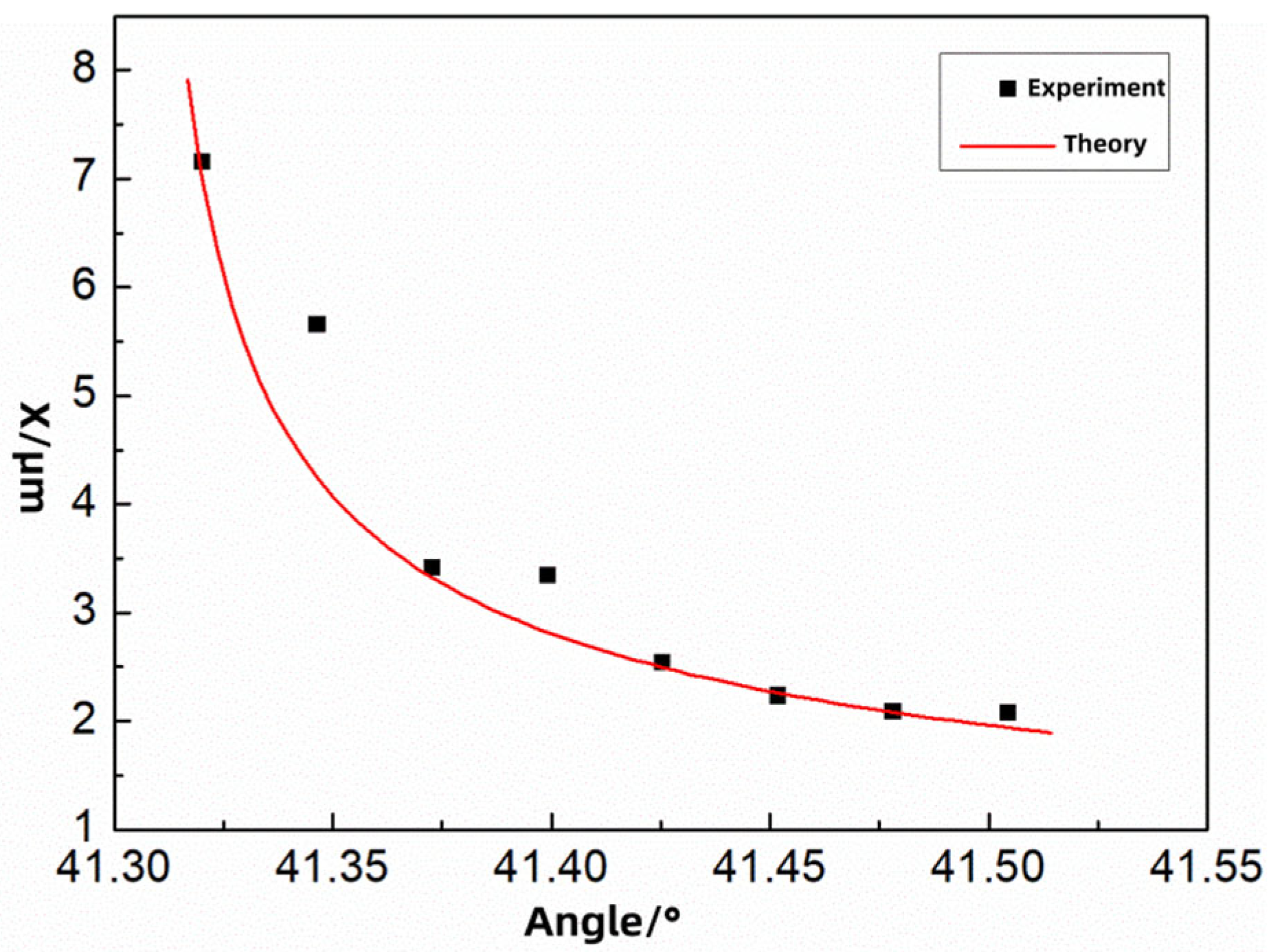 Near the critical angle of total reflection, a maximum displacement of 2 μm was measured, which is approximately 11.3 times the wavelength of the incident light. As the incident angle further increased, the displacement decreased rapidly before stabilizing at 2 μm. It can be concluded that the theoretical and experimental results are in good agreement. Furthermore, the measurement results of this experiment are consistent with both the trend and order of magnitude of GH displacement reported in Reference [