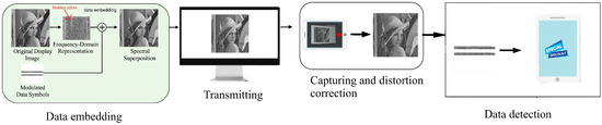 With the increasing number of screens and cameras in handheld devices, display-to-camera (D2C) communication [1,2] is becoming an alternative data transfer technology that can be compared to traditional QR codes [3,4] and 2D barcodes [5,6]. It can be considered as a sub-field of visible-light communication (VLC) [7,8] and optical camera communications (OCC) [9]. VLC primarily relies on data transfer through LEDs and photodiodes and has been explored for indoor wireless communications [10], underwater data transmission [11], and vehicular communication [12]. In OCC, data are transmitted by modulating the light intensity captured by the camera sensor. D2C communication involves data exchange between a visual display and a camera. In this approach, the display acts as a transmitter, emitting visual signals that are captured by the camera’s imaging sensor. The camera then decodes these signals to extract the embedded information. By utilizing the existing display and camera hardware in devices such as smartphones, tablets, and laptops, D2C communication has gained increasing interest and found applications in different domains, including mobile device interaction, augmented/virtual reality (AR/VR), interactive installations, digital signage, advertising, and even smart TVs. Furthermore, D2C communication can operate in real time, enabling interactive and dynamic data exchange between the display and the camera. This capability supports a wide range of potential applications across different domains, such as gaming, navigation, wayfinding, remote collaboration, education, retail, and training. For example, D2C communication enables a more immersive AR/VR experience. In museums or art exhibition settings, D2C communication allows users to access detailed information about a specific art.