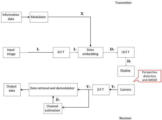 The remainder of this paper is organized as follows. Section 2 details the proposed hidden-pilot-based DFC system model and the data-embedding process and describes the hidden pilot insertion technique, including the mechanism for data and power allocation. Section 3 describes the channel impairments—particularly the perspective distortion modeling and correction. In Section 4, we describe the data detection and decoding process. Section 5 presents a performance evaluation of the proposed iDFC scheme in terms of various system design parameters. We also compare our proposed method to conventional and iterative DFC schemes. Finally, Section 6 concludes the paper.