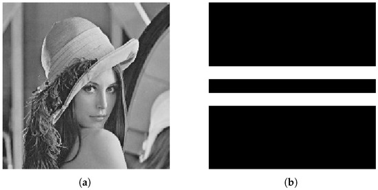 Figure 3a presents the original image, a grayscale Lena image, used for data embedding in our simulations. Figure 3b illustrates the location of the data-embedding region within the high-frequency sub-bands. This image is a map of the 2D frequency domain, showing exactly where the data are placed. The two horizontal white bands represent the data-embedding regions, while the black areas correspond to the frequency coefficients that are left unchanged. The bands are located in the high-frequency areas, avoiding the low-frequency information at the top and bottom of the frequency map.