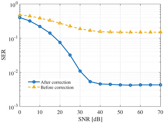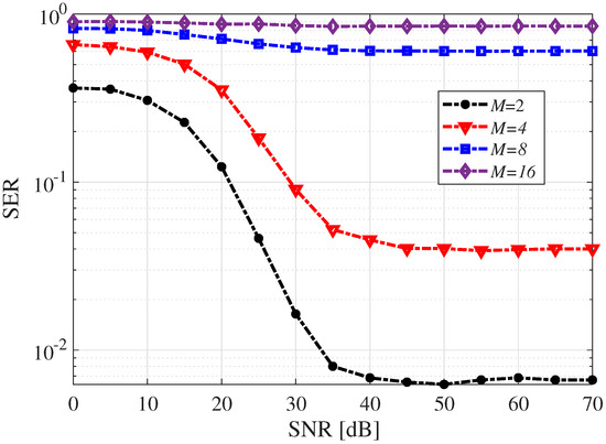 Figure 11 illustrates the SER performance of the proposed iDFC system across different modulation orders (M). It can be observed that a higher M yields a higher SER. This is due to the denser constellation points in higher-order QAM, which are more susceptible to noise and distortion. In addition, the SER saturates at high SNRs, forming an error floor due to the presence of non-Gaussian errors. Overall, lower-order modulations, such as BPSK () and QPSK (), are robust and exhibit sharp SER reductions above 20 dB, making them suitable for low-SNR or high-fidelity applications. Although higher-order modulation allows more bits to be transmitted per symbol, maintaining the same average signal energy requires constellation points to be placed closer together. As a result, the Euclidean distance between adjacent symbols decreases, making the system more prone to symbol errors in the presence of noise or distortion. These effects become more pronounced as the SNR increases. The results highlight the trade-off between spectral efficiency and robustness in modulation design for DFC systems.