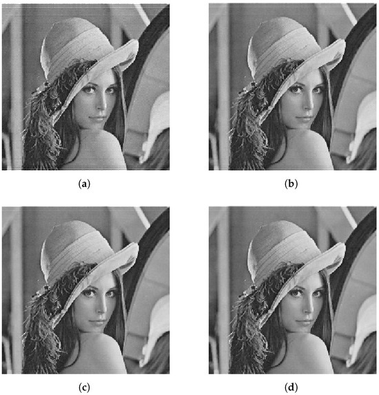 Next, let us look at the visual imperceptibility of data embedding for different image-to-data power ratios, , depicted in Figure 6. An alpha of 0.1 means that 10% of the power is allocated to the image (and 90% to data). This visual comparison is a qualitative assessment of imperceptibility—how well the hidden data are concealed from the human eye. When the image power is low, the most visible distortion is observed in Figure 6a. In other words, since the data power is high (90%), the embedded data dominates the frequency components, resulting in visible artifacts. This confirms that very low image power compromises image quality. On the other hand, if we increase the image power, there is a significant improvement in imperceptibility. In Figure 6b,c, distortion is still visible upon close inspection, but the structure of the original image is better preserved. Finally, Figure 6d, which has 70% image power, has the least perceptible distortion. The image appears smooth and nearly identical to the original (cf. Figure 3a).