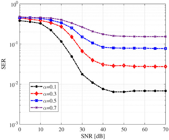 Figure 7 illustrates the SER performance of the proposed system as a function of the SNR for various image power allocation ratios, . The plot demonstrates a clear and direct relationship between the image power allocation and system performance. As the increases from 0.1 to 0.7, the overall SER performance gets progressively worse at all SNR values. This is because as is increasing, the power loaded onto the data symbols decreases simultaneously, resulting in a worse SER. In other words, when the image power is low, the data power is high. This strong data signal is robust against channel noise, resulting in a low SER. More importantly, the low overall signal amplitude causes minimal clipping, so the signal distortion is low. In addition, the results clearly demonstrate the impact of power allocation between the image signal and the data signal. First, we observe that all curves exhibit an error floor. This floor arises from inherent system errors, including clipping and quantization noise after IDFT, imperfect channel estimation using image averaging, and image-data interference in non-orthogonal embedding. The SER improves as the SNR increases up to a certain point, after which the curves flatten out. Further increases in the SNR do not improve the SER. This indicates that at high SNRs, the performance is limited by a factor other than channel noise.