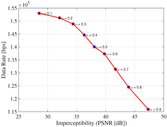 Pareto frontier illustrating the trade-off between the achievable data rate and visual imperceptibility. Each point corresponds to a specific power allocation factor, .