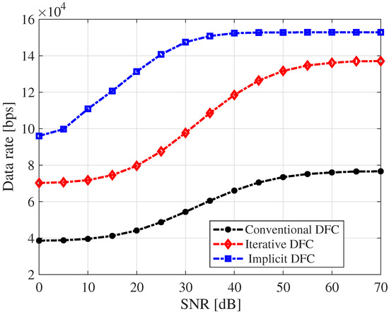 Comparison of the data rate of the proposed implicit DFC scheme with the conventional DFC [21] and iterative DFC [23] schemes.