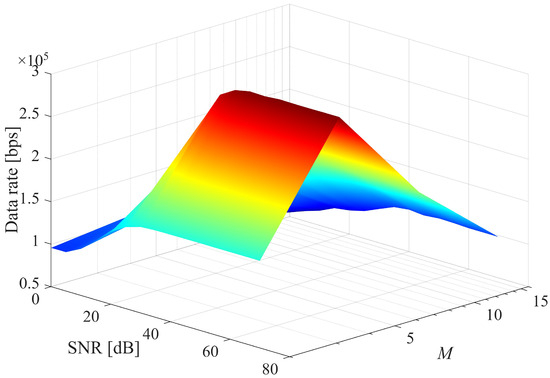 Achievable data rate performance versus modulation order (M) versus the SNR.