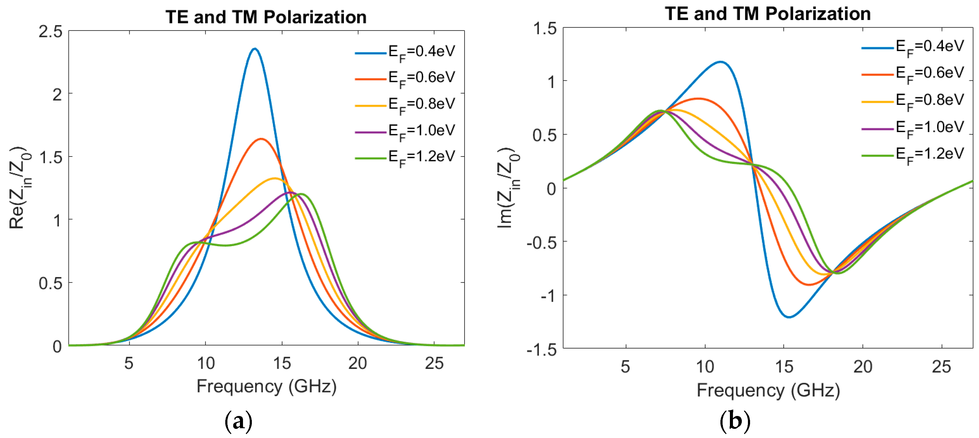 Figure 5. Real part (a) and imaginary part (b) of the normalized input impedance Z i n   / Z 0   as a function of frequency at different Fermi energies.
