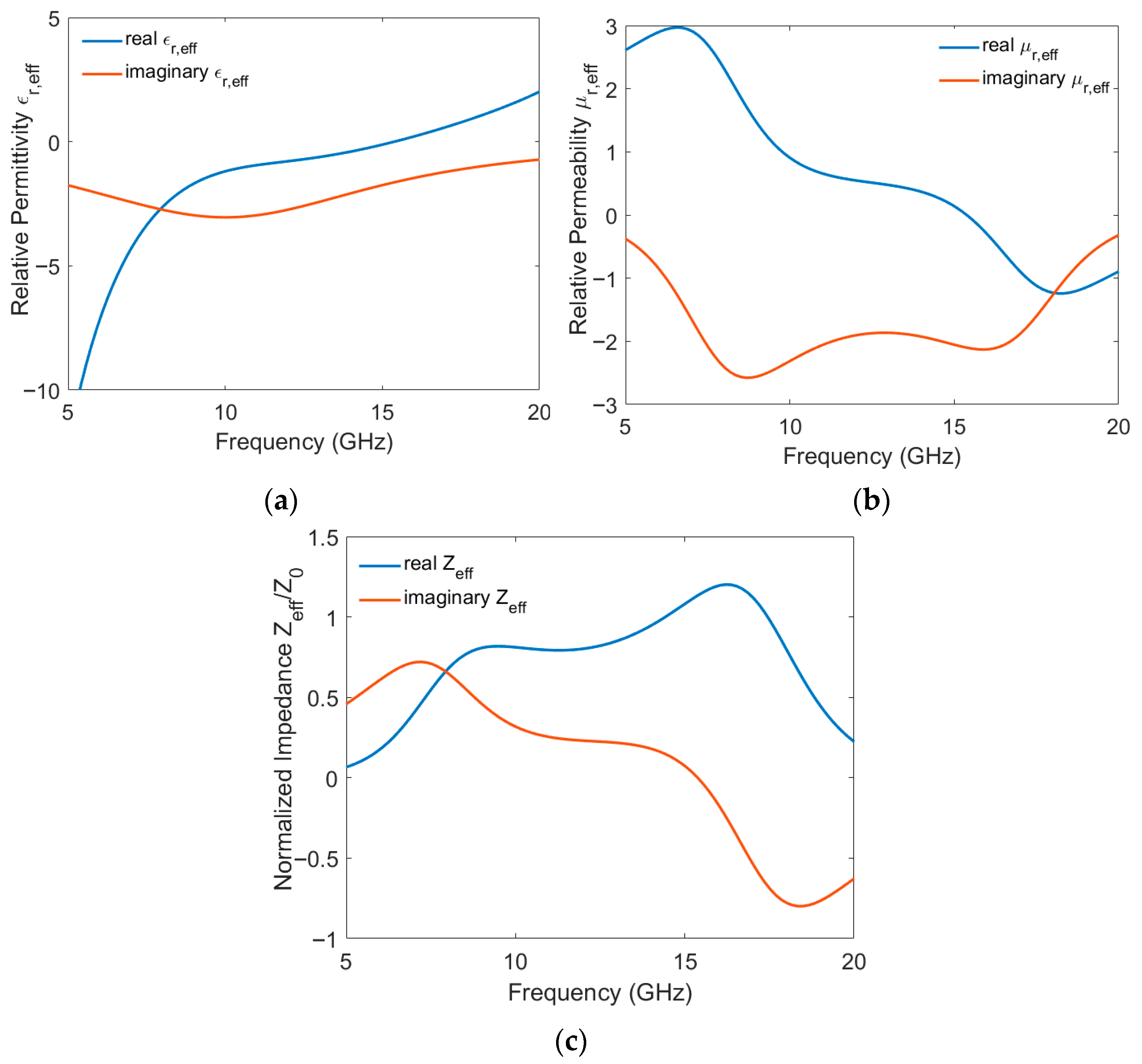 Figure 6a,b show the effective permittivity ε r , e f f f and the effective permeability μ r , e f f f of the proposed absorber as a function of frequency. It can be seen that, in the frequency range of interest (X and Ku bands), the structure exhibits a single-negative (SNG) metamaterial property characterized by a negative value of either the real permittivity or the real permeability [41]. The imaginary parts of the permittivity and permeability account for the losses and represent the material’s impact on absorbing the incident electromagnetic waves. Using the extracted electromagnetic parameters ε r , e f f f and μ r , e f f f , the normalized effective impedance as a function of frequency can be calculated as [39]