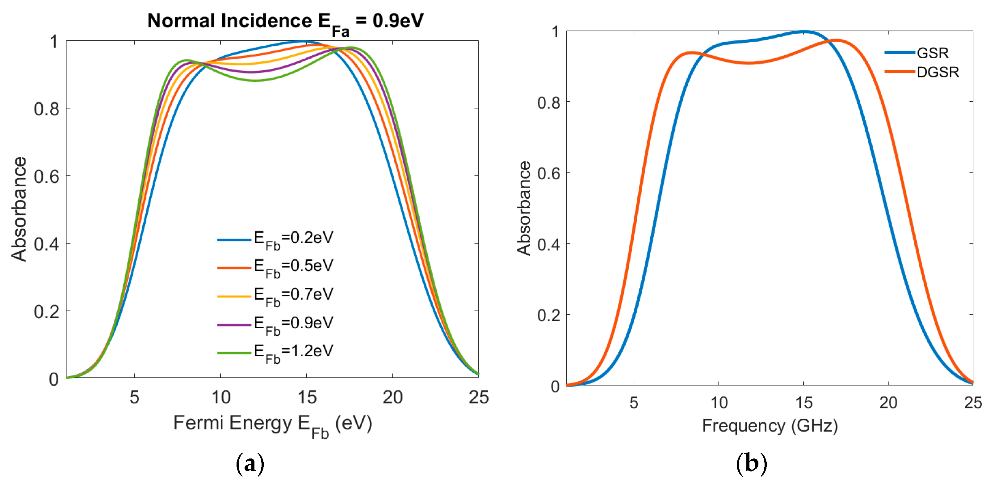 The optimized parameters can be determined through an iterative optimization technique using our ECM. Keeping the thickness h 1 equal to one-quarter wavelength in the medium, the thickness h 2 < h 1 = 3.2   m m is swept for different pairs of Fermi energies E F a , E F b in the range (0.2 eV–1.2 eV) to find the optimum values that achieve the maximum absorption bandwidth with absorbance A 90 % . It is found that, for E F a = E F b = 0.9   e V and h 2 = 21.5 μ m , a maximum absorption bandwidth of 11.7 GHz is achieved, covering the X and Ku bands. Figure 11a shows the absorbance spectrum of the DGSR absorber for the case of normal incidence at different Fermi energies E F b with E F a = 0.9   e V . Figure 11b provides a comparison between the absorbance spectra of the DGSR and the GSR absorbers. As can be seen, taking an absorbance of 90% as a reference, a significant bandwidth enhancement of approximately 3 GHz is achieved. Moreover, the absorber possesses an RBW of about 90%. However, it should be noted that the absorbance of the DGSR absorber is slightly decreased compared with that of the GSR absorber.