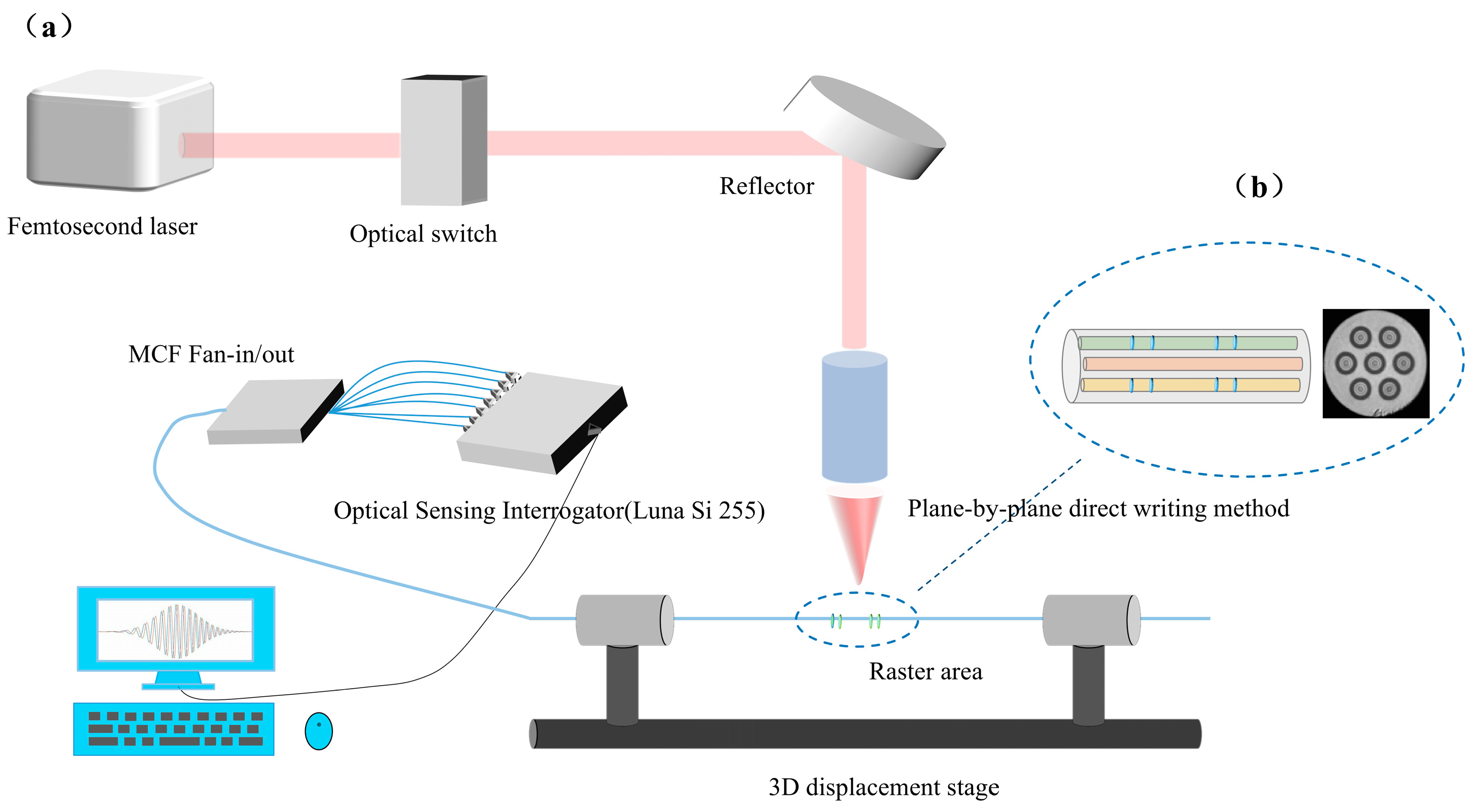 Figure 3a depicts the schematic of the FBG inscription system developed in our laboratory. The setup consists of a femtosecond laser system, a micro-machining stage, a real-time FBG monitoring system, and a positioning assistance system. Using this system, femtosecond laser plane-by-plane direct writing was employed to selectively inscribe FPIs into two chosen peripheral cores. In this study, core 3 and core 7 were selected as the sensing channels.