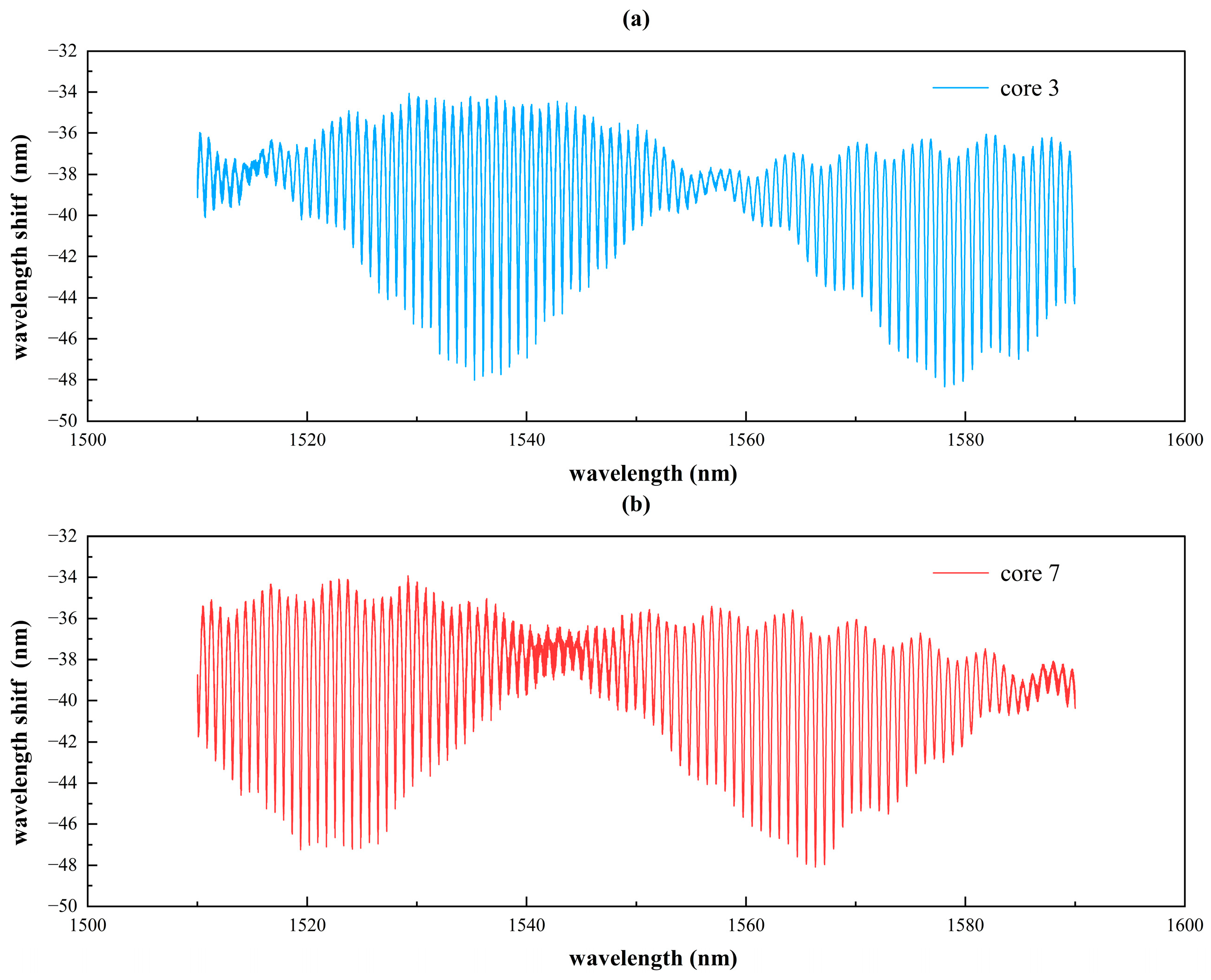 into the theoretical Equation (6), the FPI wavelength shift of any two peripheral cores