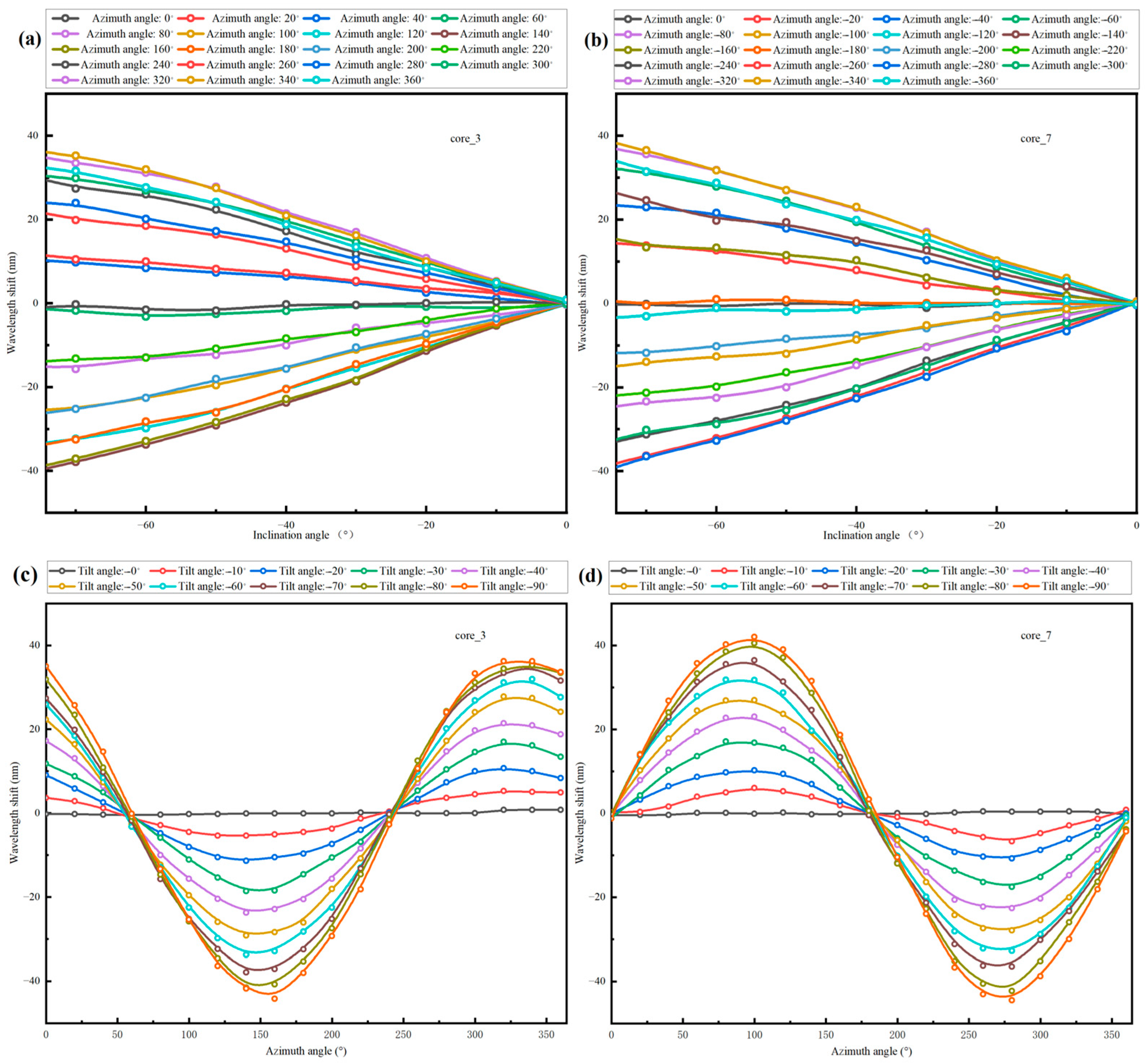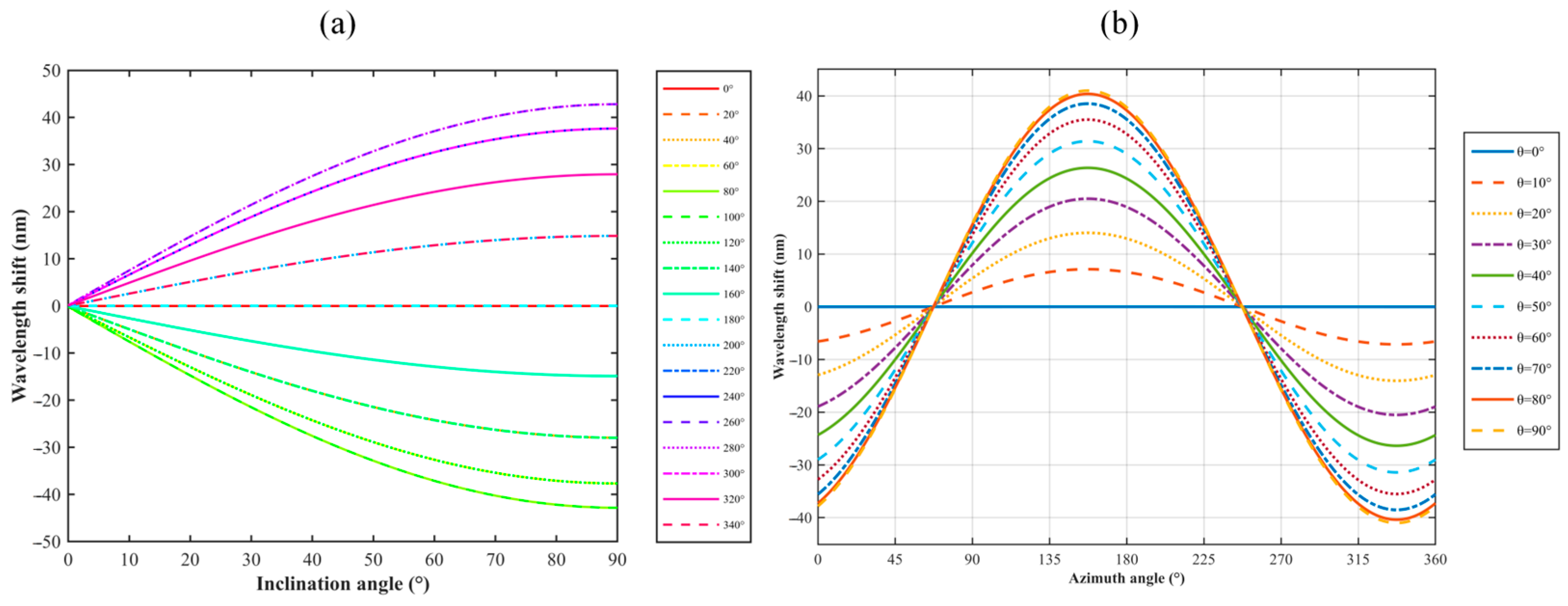 Regarding subplot (a), first, by fixing the azimuth angle in Equation (13), simulations were conducted for the inclination angle and wavelength shift with a step size of 0.09° over the range of 0° to 90°. Subsequently, simulations were carried out for different azimuth angles with a step size of 20° over the range of 0° to 360°, examining the relationship between the inclination angle and wavelength shift under various azimuth conditions. Regarding subplot (b), first, by fixing the inclination angle in Equation (13), simulations were conducted for the azimuth angle and wavelength shift with a step size of 0.36° over the range of 0° to 360°. Subsequently, simulations were performed for different inclination angles with a step size of 10° over the range of 0° to 90°, examining the relationship between the azimuth angle and wavelength shift under various inclination conditions.