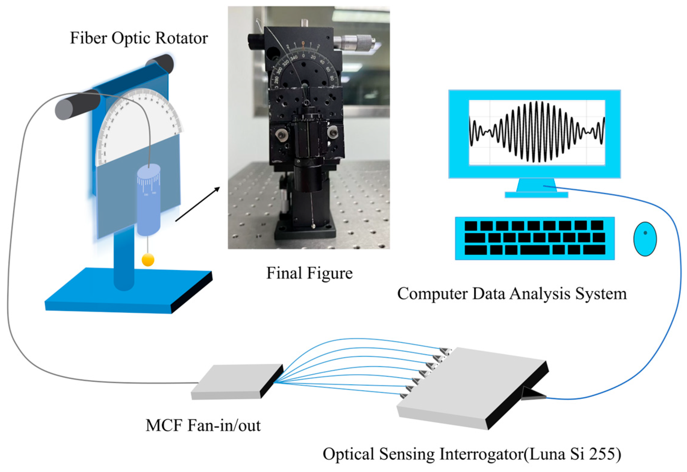Figure 7. The inclinometer was fixed on the fiber- optic rotator, the multi-core fiber was connected to a fan-out device, and the SMF outputs of cores 3 and 7 were connected to the optical sensing interrogator (Luna, Si 255, Roanoke, VA, USA). Using the Enlight app, reflection spectra data corresponding to each core under various tilt conditions were recorded and processed on a computer.