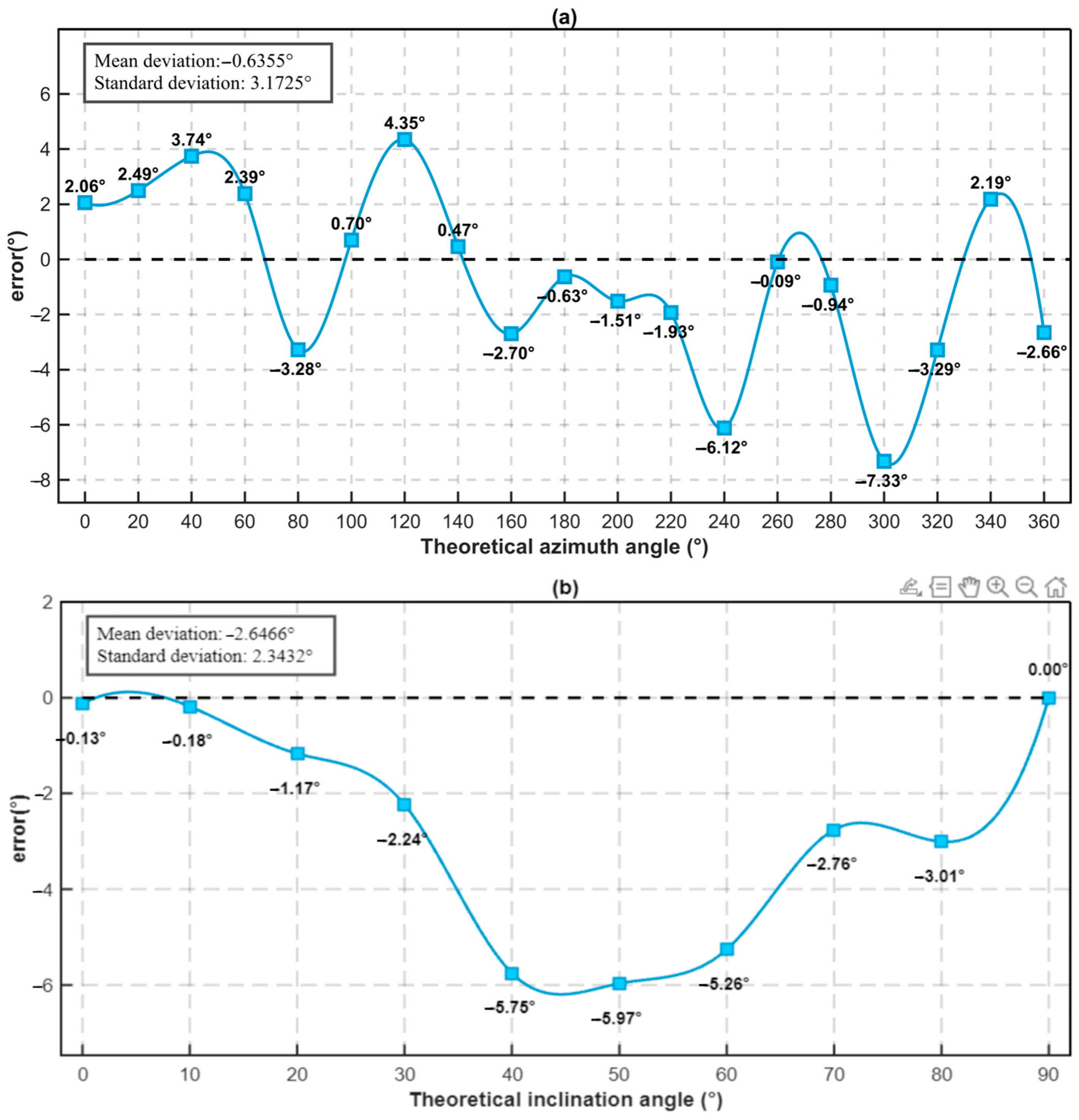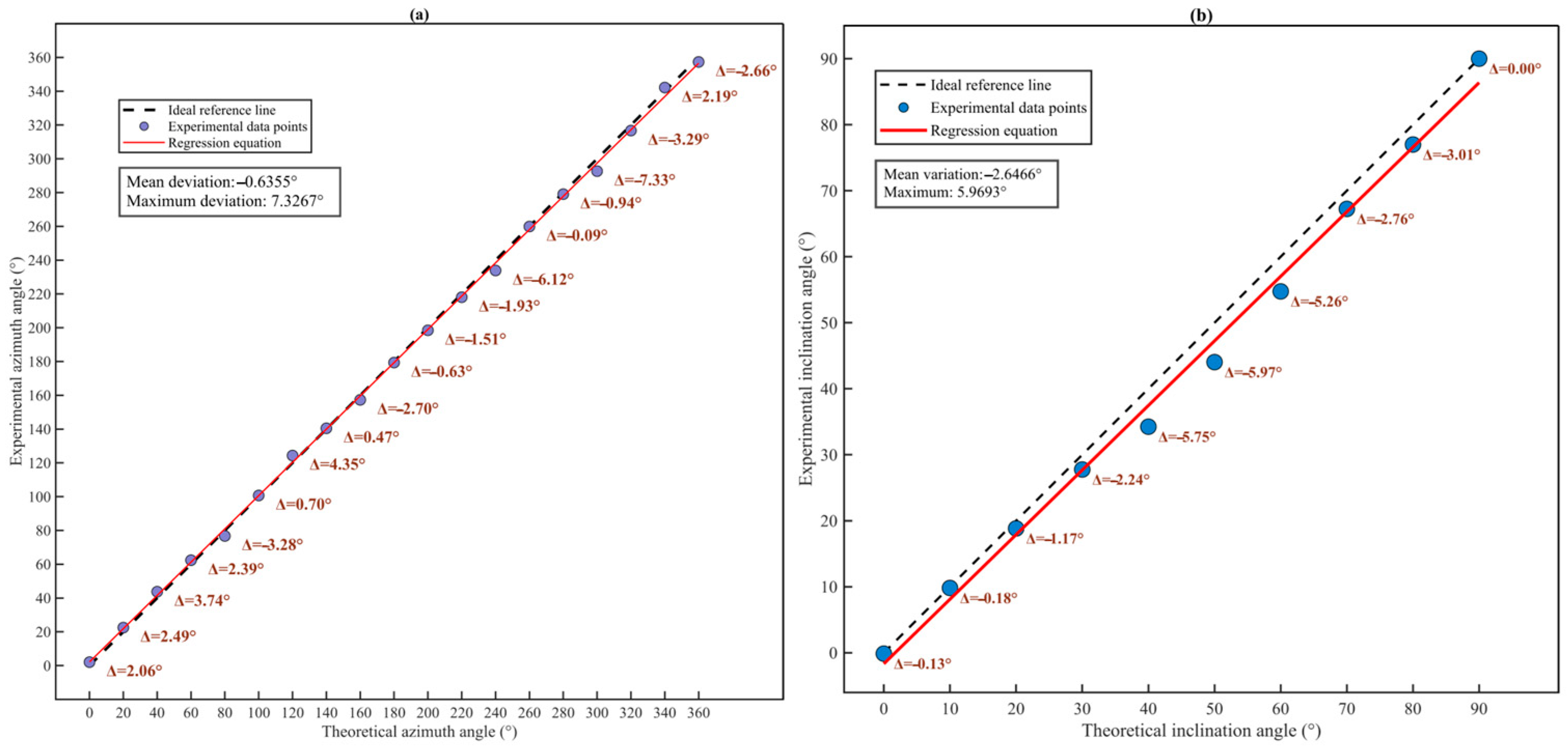 By substituting the experimentally obtained wavelength shift into the theoretical models of Equations (11) and (12), the corresponding theoretical azimuth and inclination angles were calculated. Therefore, using the wavelength shift as an intermediary variable, the experimental angles were compared with their theoretical counterparts, as shown in