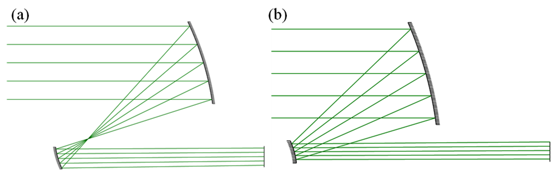 Figure 2. Layout of the light path of two telescopic structures. (a) Kepler structure; (b) Galilean structure.