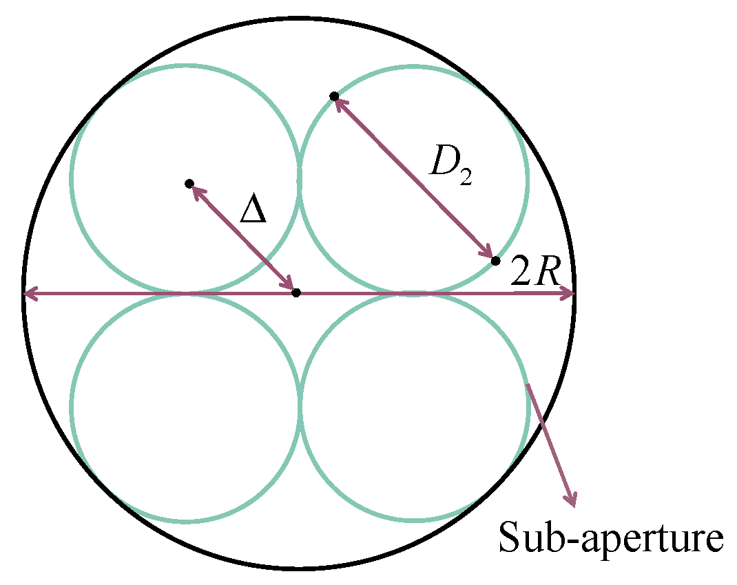 Since the pixel size of the infrared detector is larger than that of the visible light band, increasing the detector’s usage rate is essential to preserving more information about the detecting target. The image plane of each channel of the divided-aperture should be distributed as far as possible so that the image plane center of the subsystem is located in the center of the four quadrants of the detector. Figure 4 shows the layout diagram of the aperture-divided system, where the decenter value of the aperture-divided system is Δ , the circumradius of the aperture-divided system is R , and the outer diameter of the optical system with the divided aperture is D 2 .