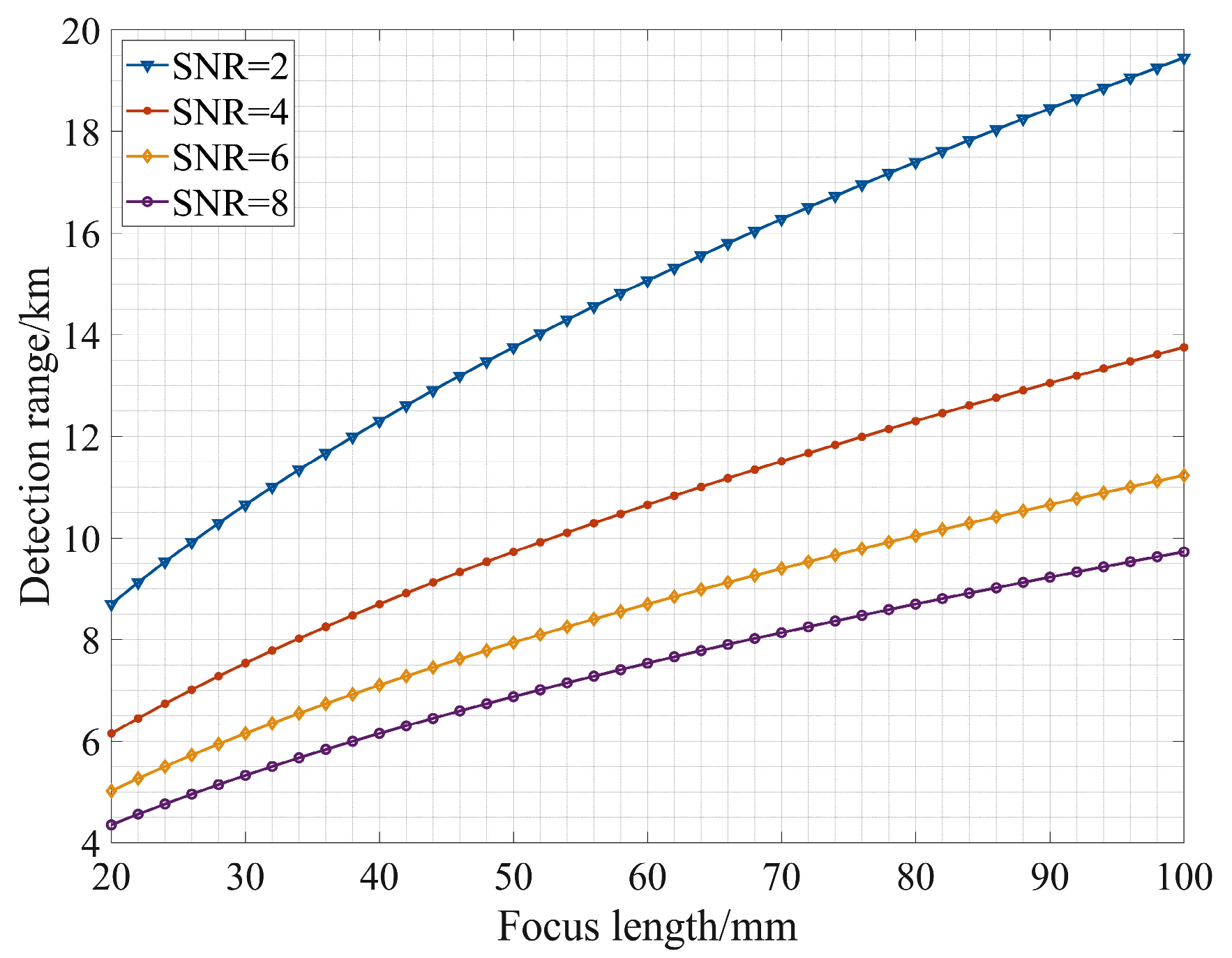 The selected detector is a cooled MWIR detector with a working wavelength range of 3.7–4.8 μm, pixel number of 640 × 512, pixel size of 15 μm, and F-number of 2.0. The technical characteristics of the system can be determined if the focal length of the infrared aperture-divided system can be ascertained, followed by the entrance pupil diameter of the optical system. The photosensitive area A d is determined by the detector pixel size. The specific detectivity D is 3 × 10 11 cm Hz 1 / 2 / W , and the detector integration time is 0.7 ms. The atmospheric transmittance τ a is obtained from the MODTRAN model for a 50 km range under standard conditions (23 km visibility) in the MWIR band. The effective aperture diameter D 0 , transmittance τ 0 , and F-number F are derived directly from the designed optical system. The optical system transmittance is determined based on the number of lenses and the parameters of the single-layer anti-reflection coating and is set to 75% in this work. Figure 5 illustrates this relationship between the infrared detecting system’s focal length and detection distance. If the limit signal-to-noise ratio is 4.0, the focal length of the infrared aperture-divided system should be at least 50 mm to achieve detection at a distance greater than 10 km.