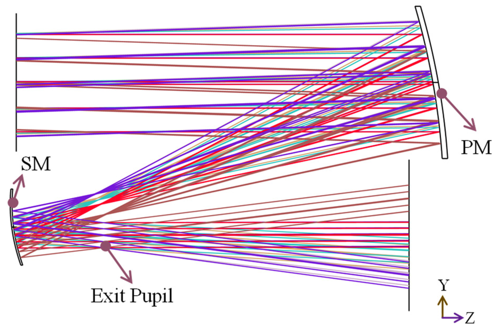 Figure 11 depicts the layout for the whole system, which includes the PM, SM, aperture-divided module, and relay lens group. Different colors represent different fields of view. The detailed surface data and the configuration of the off-axis catadioptric aperture-divided optical system are listed in Table 2. The size of the overall optical structure is only 280 mm (length) × 80 mm (width) × 150 mm (height), with a highly folded layout.
