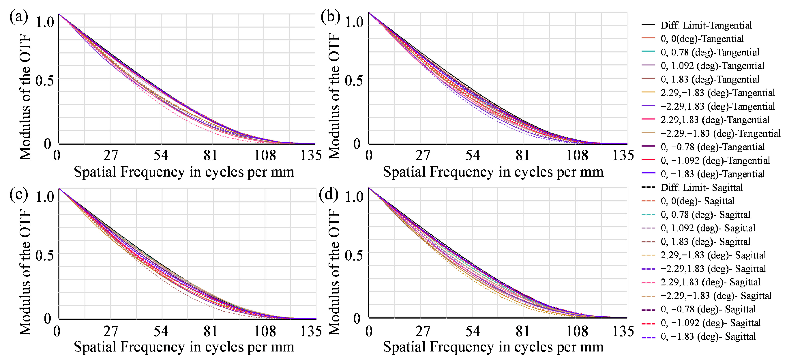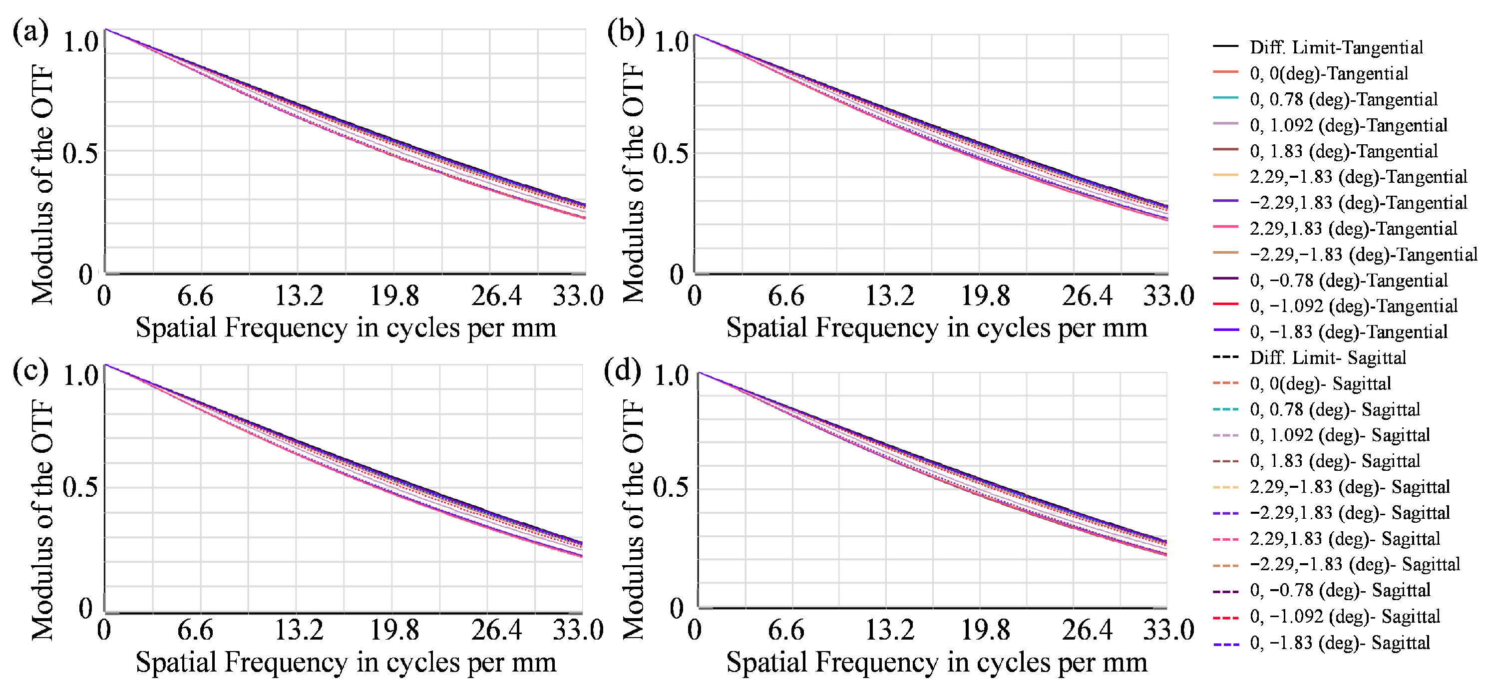 Figure 10. MTF curves of the intermediate image plane with different aperture-divided structures. (a) represents the aperture-divided with eccentricity (+x, +y), (b) represents the aperture-divided with eccentricity (+x, −y), (c) represents the aperture-divided with eccentricity (−x, +y), and (d) represents the aperture-divided with eccentricity (−x, −y).