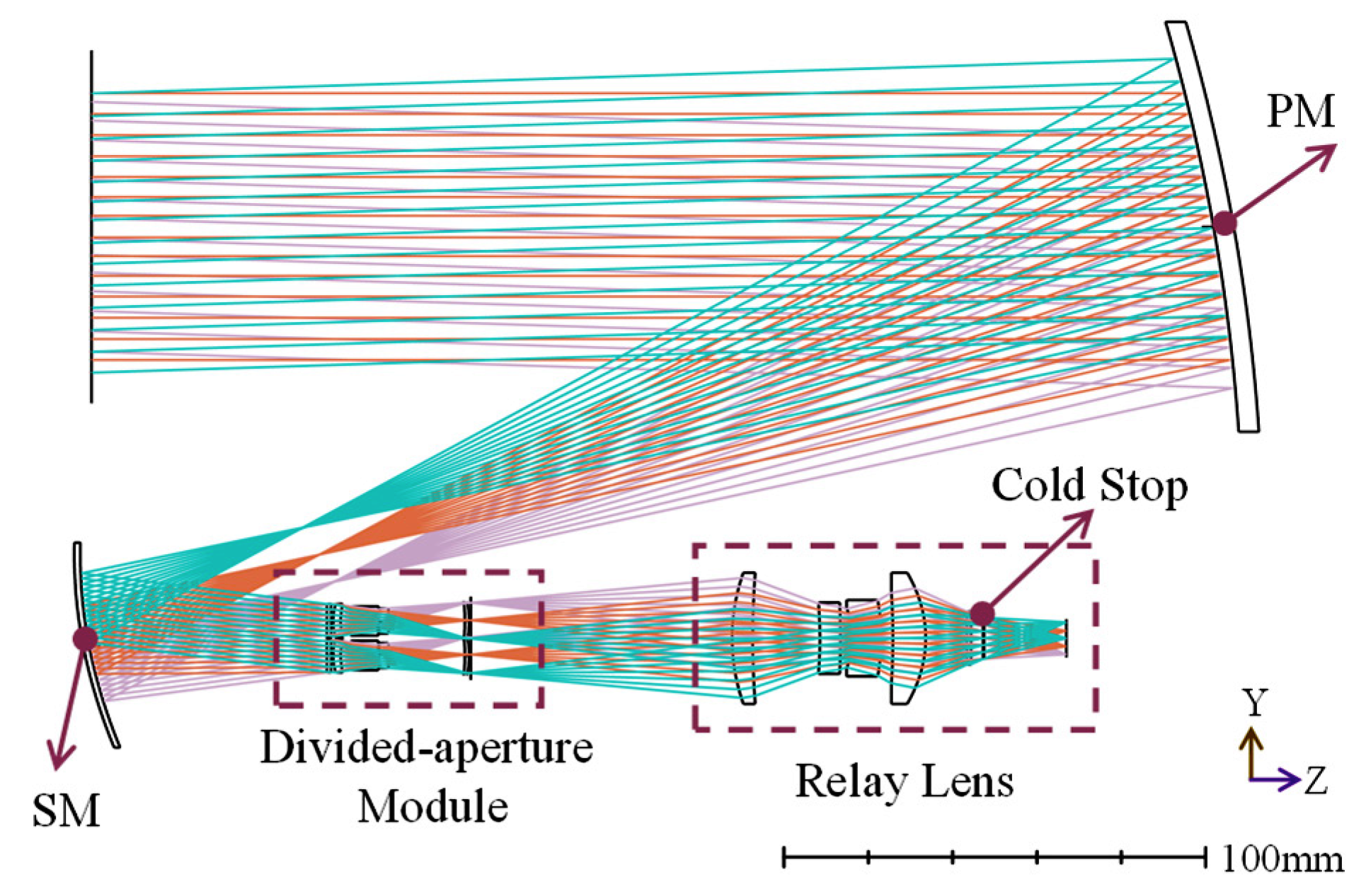 To achieve image plane matching of the imaging detector and achieve 100% cold shield efficiency, a relay mirror group needs to be introduced after the aperture-divided module. When designing the relay lens group, the main factors to be considered include the problem of pupil connection, the conjugate relationship between the object plane and image planes, the selection of optical materials, and the balance of aberration. The relay lens group enables object space telecentricity, which is not only conducive to achieving pupil matching with the aperture-divided optical module, but also conducive to achieving 100% cold shield efficiency.