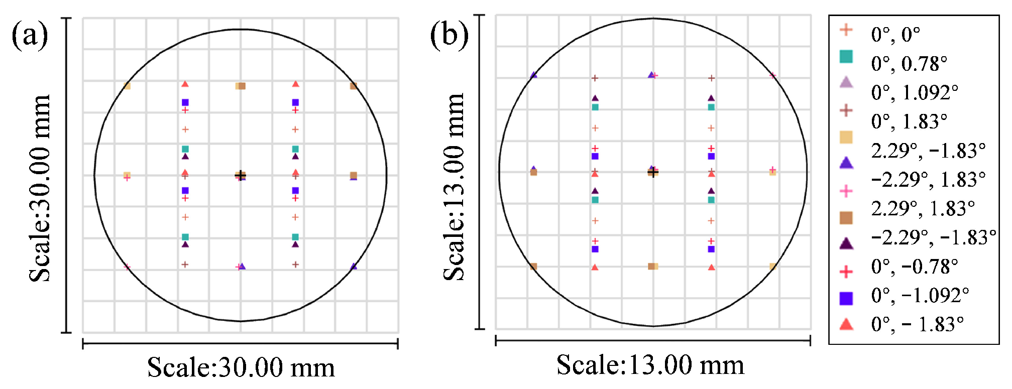 The spot diagrams of different channels with the field of view in object space are presented in Figure 14. The root mean square (RMS) radius of the spot diagrams is much smaller than the Airy disk, which is shown as the circle in the black line. In addition, the average RMS wavefront errors of different sub-aperture systems are less than 0.04 waves. These image quality evaluation metrics collectively demonstrate that the high-order residuals are well controlled.