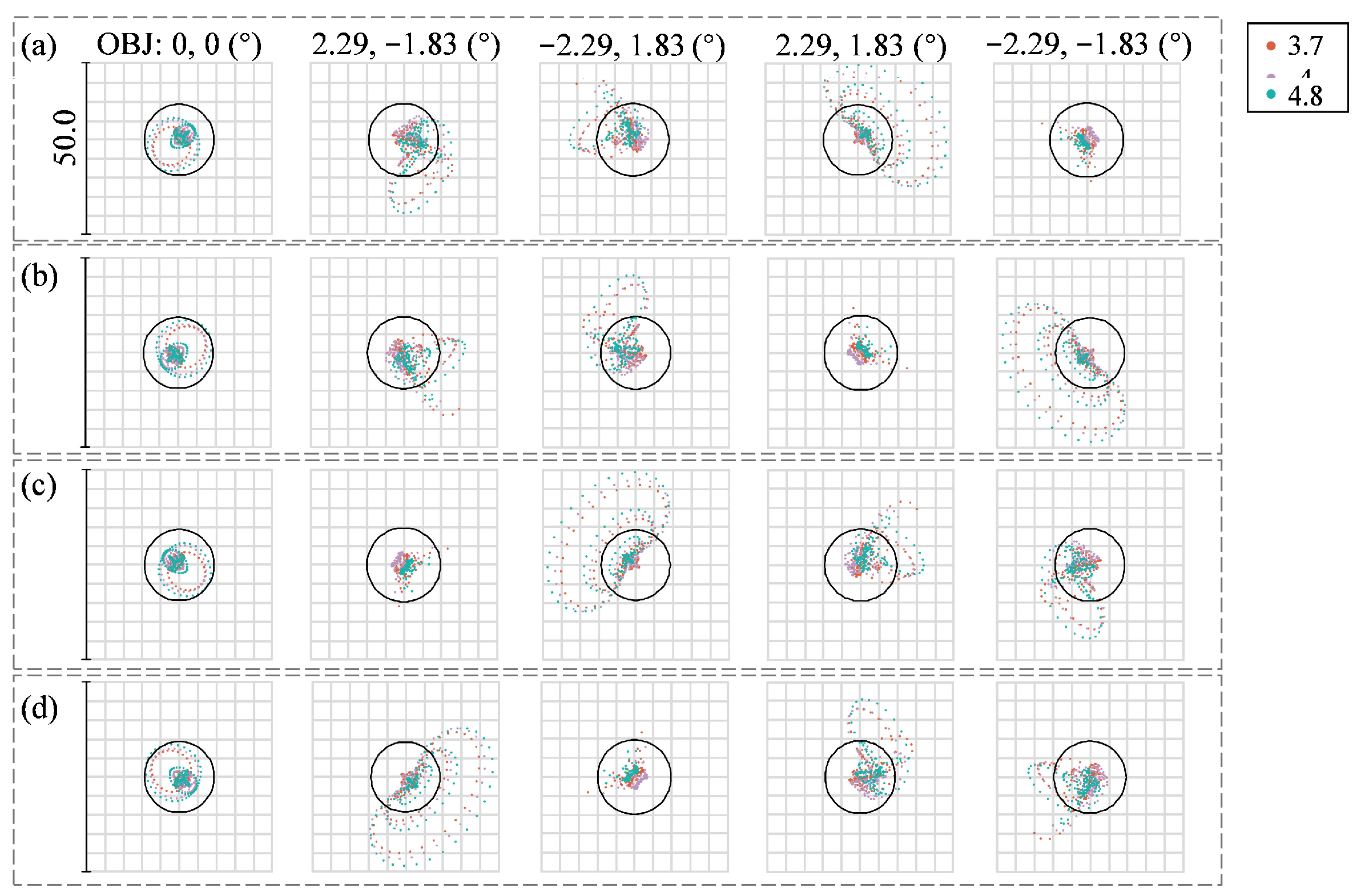 Figure 14. Spot diagram of off-axis aperture-divided optical systems with different channels. (a) represents the aperture-divided with eccentricity (+x, +y), (b) represents the aperture-divided with eccentricity (+x, −y), (c) represents the aperture-divided with eccentricity (−x, +y), and (d) represents the aperture-divided with eccentricity (−x, −y).