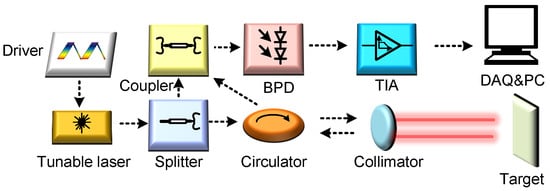 The fundamental architecture of the FMCW LiDAR system is illustrated in Figure 1, which presents a block diagram of a direct detection-based laser ranging configuration. In this system, a triangular waveform generated by a driver modulates a tunable laser source, producing a continuous-wave optical signal with a periodically swept frequency. The emitted light is split into two paths: the measurement beam, directed toward the target via a circulator, and the reference (local) beam, sent to an optical coupler. The measurement beam is collimated, transmitted to the target, and the reflected signal is re-collimated and guided back through the circulator to the coupler. There, it interferes with the local beam, and the resulting optical interference is detected via a balanced photodetector (BPD), which converts it into an electrical beat frequency signal. This signal is then amplified via a trans-impedance amplifier (TIA). The target distance is determined by analyzing the frequency of the beat signal.