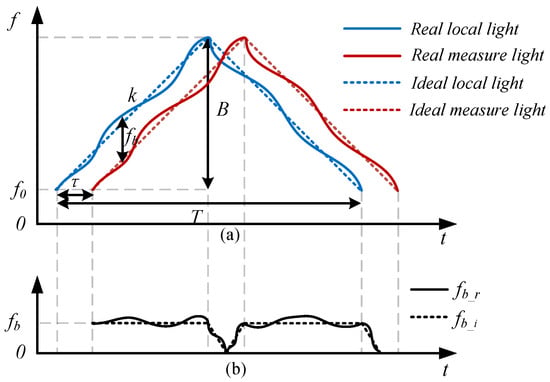 The FMCW LiDAR nonlinearity schematic: (a) FMCW signal sweeping and (b) FMCW beat frequency signal.