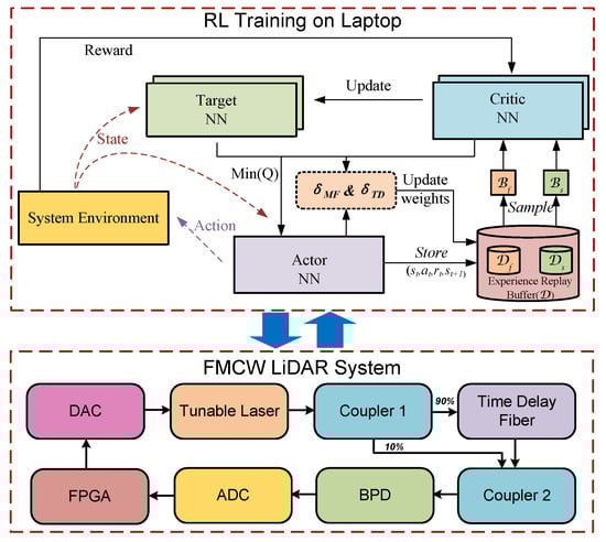 The structure of HPER-SAC is shown in Figure 3. First, the FMCW LiDAR experimental system section, where an Field-Programmable Gate Array (FPGA) generates the original modulated signal, which is then converted into a drive signal via a digital-to-analog converter (DAC) to drive a tunable laser to generate laser light. The laser light is split by a coupler into 10% local light and 90% measurement light. The measurement light then passes through a time-delay fiber before entering a second coupler simultaneously with the local light, where they are mixed and frequency-converted into beat signals via a BPD. Then, an analog-to-digital converter (ADC) quantizes and collects the beat frequency signal to the FPGA. The FPGA transmits the digitized beat frequency data and the original modulation signal to the laptop via a network protocol and initializes the system environment required for RL training. Then, the HPER-SAC reinforcement learning network algorithm is started. First, the actor interacts with the environment and stores the samples in the experience replay buffer. Then, it calculates the beat frequency MF and TD error between adjacent segments within the sweep frequency period to construct a mixed priority experience pool and automatically adjust the proportion of replayed experiences. After training the agent, probabilistic sampling is performed from the experience replay buffer, and the parameters of the critic network are updated. Simultaneously, the target network undergoes a soft update to guide the Actor network in updating the signal modulation actions. The specific HPER-SAC algorithm steps are shown in Algorithm 1.