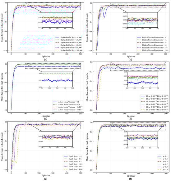 Agent performance evaluation with different hyper-parameters: (a) Replay buffer size, (b) Hidden neuron dimensions, (c) Action noise variance, (d) Learning rate of Actor and Critic NN, (e) Batch size, (f) Discount factor.