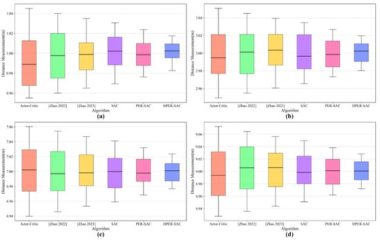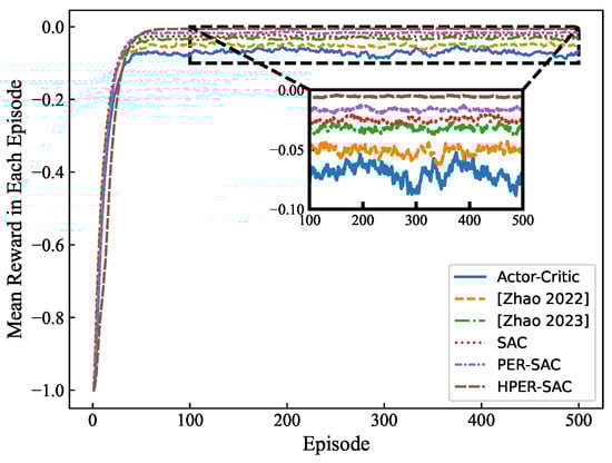 Then, we evaluated the training performance of six algorithms: the standard actor-critic method, the model-based reinforcement learning approach from Ref. [], the twin-critic actor-critic method from Ref. [], the original SAC, the prioritized experience replay SAC (PER-SAC), and the proposed hybrid prioritized experience replay SAC (HPER-SAC). As illustrated in Figure 5, the optimized HPER-SAC algorithm demonstrates clear advantages over the others in terms of maximum achieved reward, convergence speed, and stability, thereby validating its effectiveness.