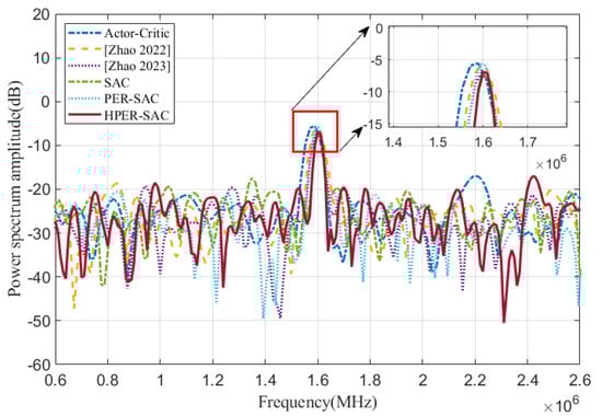 Comparison of power spectra of beat frequency signals under different compensation methods including [Actor-Critic], [Zhao 2022] [], [Zhao 2023] [], [SAC], [PER-SAC] and our [HPER-SAC].