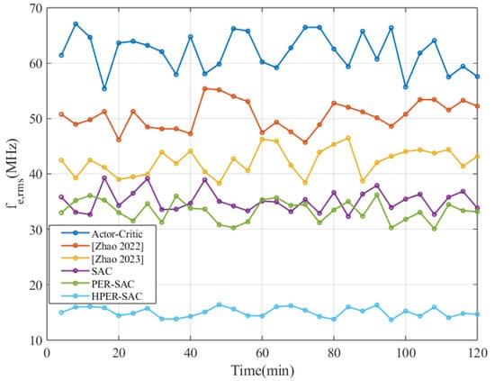 To evaluate the stable nonlinear correction effect and resolution of the FMCW laser, we need to monitor the long-term performance stability of the nonlinear correction method and its adaptability to laser performance degradation to assess the reliability of this model in practical applications. The FMCW LiDAR nonlinear correction experimental system operated continuously for over 2 h, updating the correction results every hour under constant parameters, and the root mean square (RMS) value of nonlinear error was used to evaluate the stability of nonlinear correction. We also compared the stability of correction effects from other methods, as shown in Figure 7. It can be observed that, with the accumulation of time, the relative value exhibits the greatest variability in the 55–68 MHz range for the ActorCritic algorithm, while the variability ranges for the methods in [,] are approximately 50 MHz and 40 MHz, respectively. The fluctuations of the SAC and PER-SAC algorithms both fall within the range of 40–50 MHz. Finally, the proposed HPER-SAC algorithm exhibits the smallest fluctuation range at around 15 MHz. Therefore, after the correction results are compared over an extended period, our proposed method demonstrates a significant stability advantage over other methods.