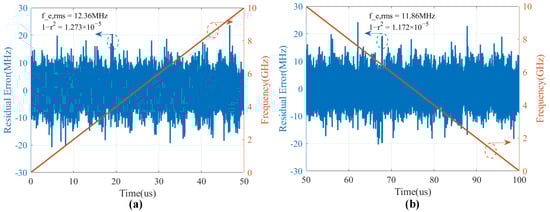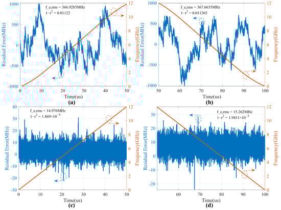 The outcome of up sweep and down sweep of FMCW laser after compensation are plotted in Figure 8c and Figure 8d, respectively. At the same time, in order to compare with the nonlinear correction results, we also present the original uncorrected laser sweep results. In Figure 8, the orange curve indicates the frequency variation of light sweep, and the blue curve represents the residual error, which means the difference between the actual frequency and the ideal frequency. The indicators and directly reflect the frequency linearity of the sweep light. The of up and down sweep light are 14.976 MHz and 15.262 MHz. The indicator of them are and . The smaller these two parameters are, the higher the linearity of the FMCW laser sweep.