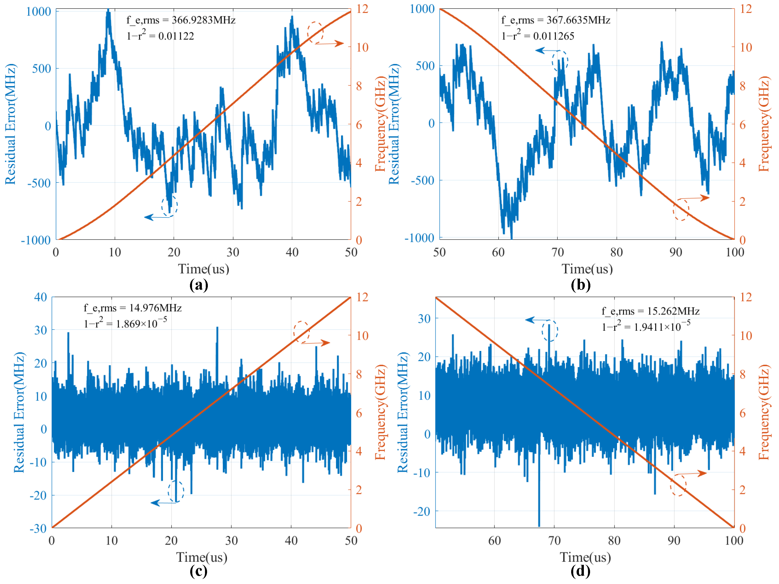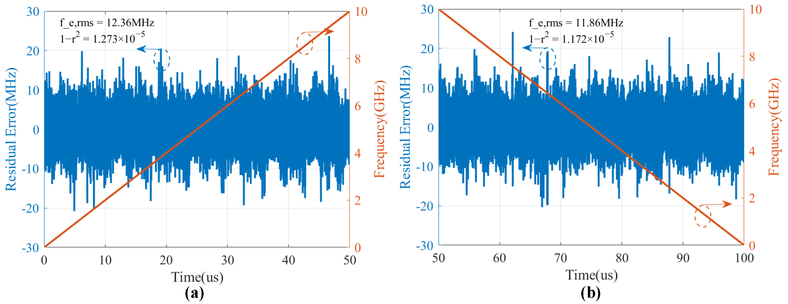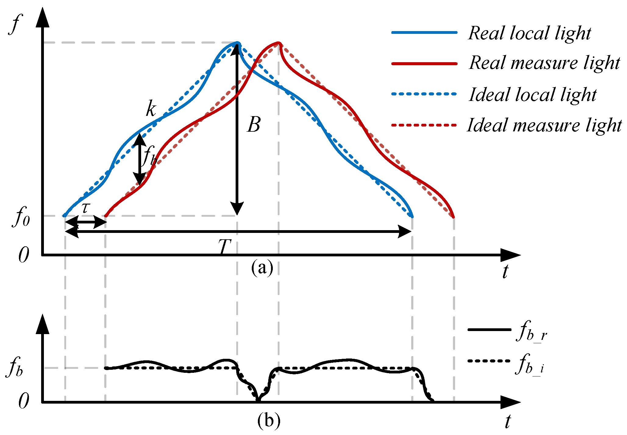 Figure 2, the dashed line illustrates the ideal linear frequency modulation trajectory, while the solid line represents the actual, non-ideal modulation behavior encountered in real-world scenarios.