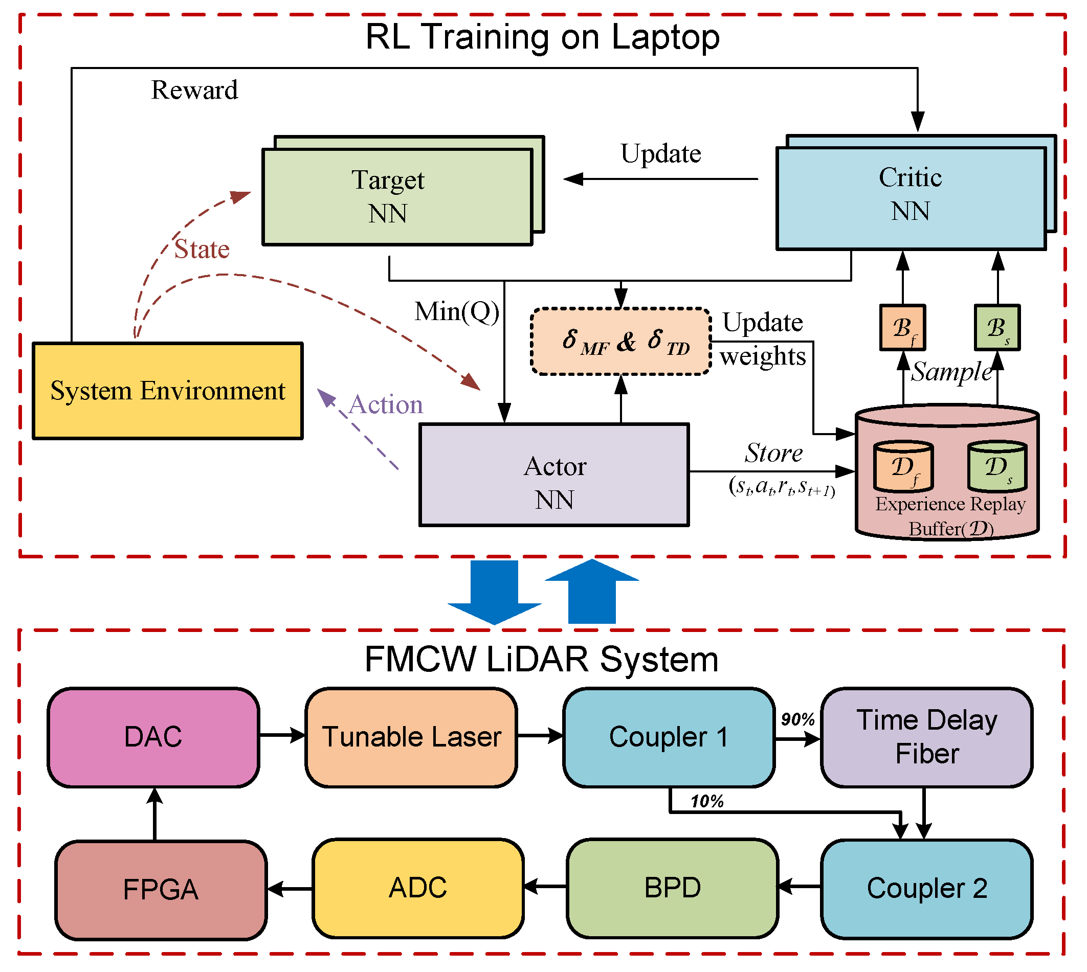 Figure 3. First, the FMCW LiDAR experimental system section, where an Field-Programmable Gate Array (FPGA) generates the original modulated signal, which is then converted into a drive signal via a digital-to-analog converter (DAC) to drive a tunable laser to generate laser light. The laser light is split by a coupler into 10% local light and 90% measurement light. The measurement light then passes through a time-delay fiber before entering a second coupler simultaneously with the local light, where they are mixed and frequency-converted into beat signals via a BPD. Then, an analog-to-digital converter (ADC) quantizes and collects the beat frequency signal to the FPGA. The FPGA transmits the digitized beat frequency data and the original modulation signal to the laptop via a network protocol and initializes the system environment required for RL training. Then, the HPER-SAC reinforcement learning network algorithm is started. First, the actor interacts with the environment and stores the samples in the experience replay buffer. Then, it calculates the beat frequency MF and TD error between adjacent segments within the sweep frequency period to construct a mixed priority experience pool and automatically adjust the proportion of replayed experiences. After training the agent, probabilistic sampling is performed from the experience replay buffer, and the parameters of the critic network are updated. Simultaneously, the target network undergoes a soft update to guide the Actor network in updating the signal modulation actions. The specific HPER-SAC algorithm steps are shown in Algorithm 1.